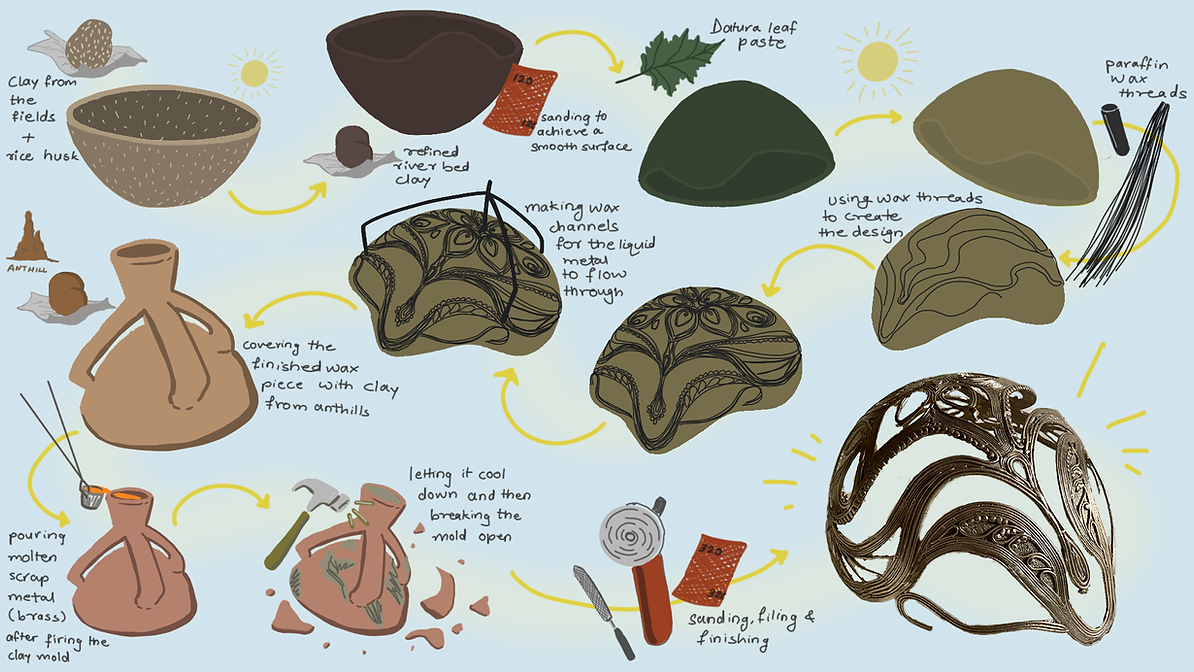 In April 2022, I went to Kondagaon in Bastar, Chhattisgarh, to work with and learn from the Dhokra craftsmen there for a duration of 2 weeks.